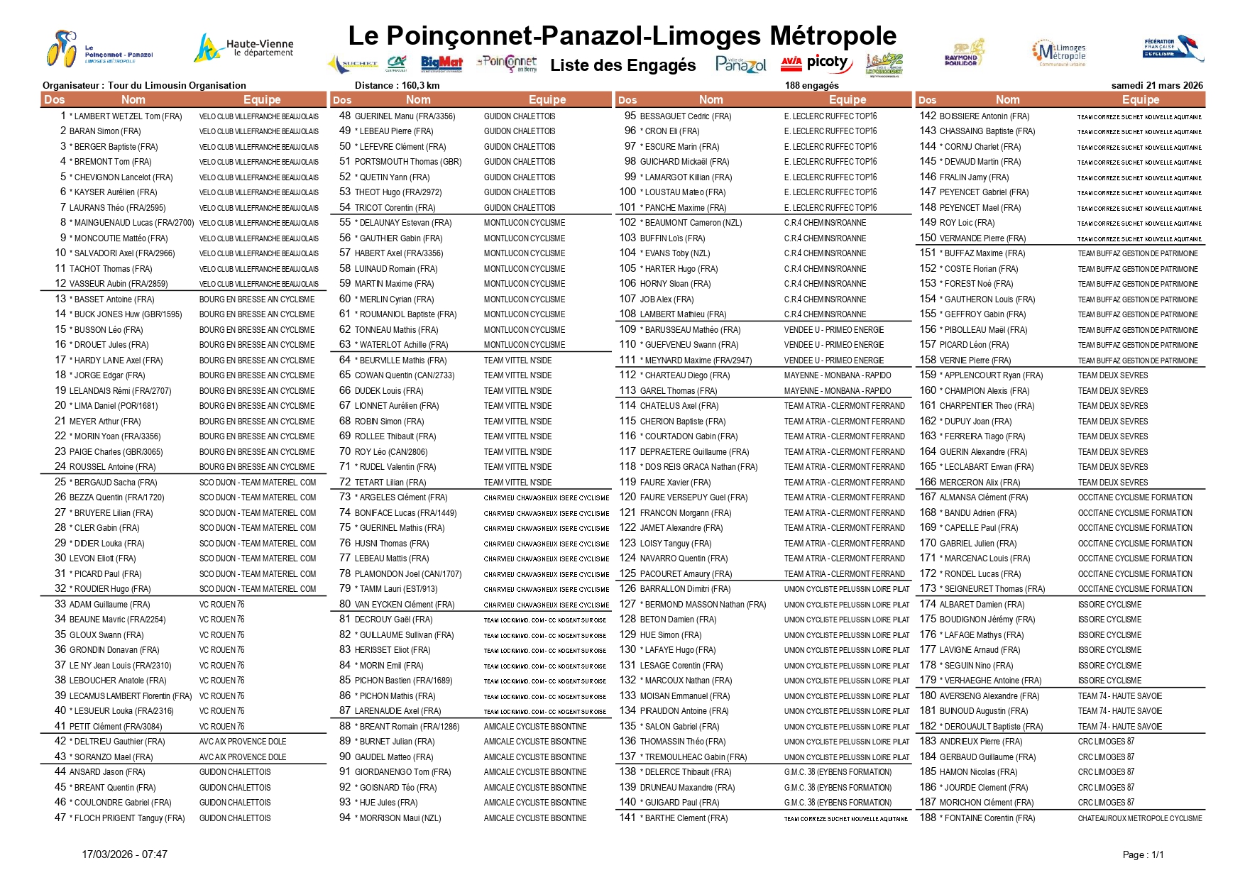 Parmi les 188 engagés à ce jour, figure les six équipes Continentales Fédérales labélisées par la Fédération Française de Cyclisme, huit équipes de Division Nationale 1, deux équipes de Division Nationale 2 et sept équipes de Division Nationale 3.